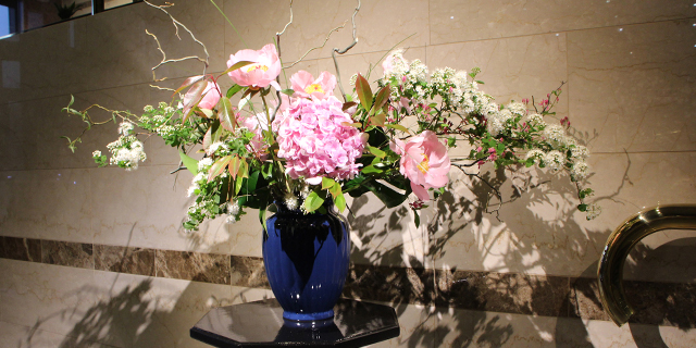 В эти дни всех гостей нашего делового центра встречает нарядная композиция икебана, составленная из японских летних цветов – роскошных пионов, пышной гортензии и нежной спиреи. Автор – Чинара Мундузбаева.